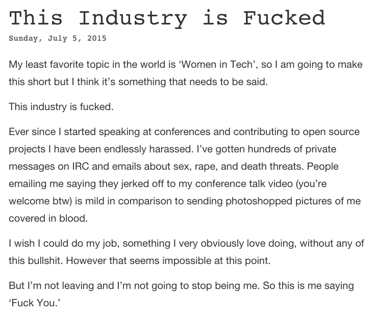 I read a short post from a fellow blogger this morning.  It was at the same time upsetting and eye opening.  You can read the original post here: https://blog.jessfraz.com/post/this-industry-is-fucked/  I include it below as well.  Thank you to @frazelledazzell for posting.  The challenges facing women in the tech industry are many, and I knew that harassment was one of them.  I was blind to the fact that the harassment went as far as Jesse Frazelle describes.
